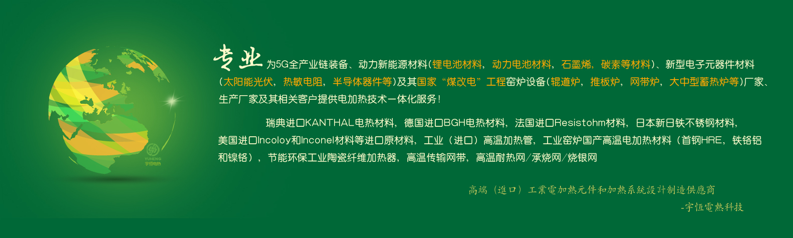 ??????公司專業生產各種精密電熱(電阻)合金、負載合金、各種電子陶瓷熱處理電熱元件、工業窯爐網帶及工業電加熱管。并代理和銷售瑞典進口康泰爾電熱合金材料,日本新日鐵進口不銹鋼材料,美國進口Incoloy和Inconel材料等進口合金產品。產品被運用在5G產業鏈裝備、鋰電池正負極材料行業、"煤改電"行業、碳纖維行業、陶瓷電子專用設備、粉體材料、海綿鈦和釩鈦產業等領域。[詳情見宇恒產品]
